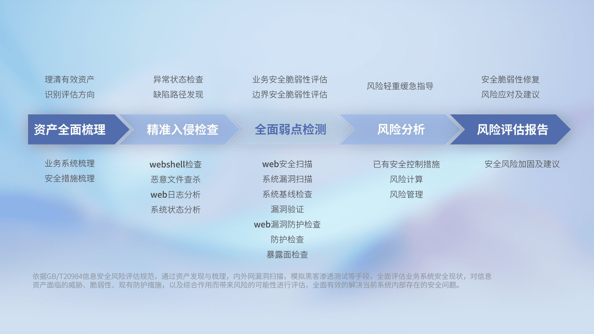 针对客户行业特性,,,,以专业的安全服务+多厂商联合解决方案提供专属的一站式安全管理服务,,,帮助客户全面感知网络空间威胁,,,基于识别、、、检测、、分析、、、防护、、监测、、、、响应的服务理论模型,,,从方案咨询、、、、集成交付、、评估验证、、、优化加固、、、运维运营,,,致力于为客户提供完整的闭环管理式安全服务。。。以实战经验为客户打造高抵御风险的安全体系,,,,帮助客户发现威胁、、、、对抗威胁、、、处置威胁,,不断积累安全对抗能力,,持续保障数字化安全。。。